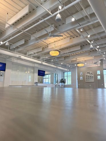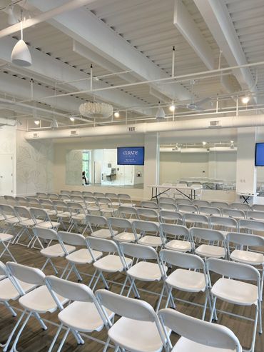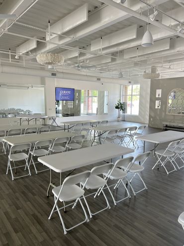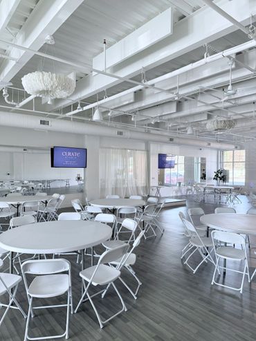 Designed with every possible need in mind, this open floor space boasts exposed ceilings and chandeliers, offering guests an insta-worthy space for private social events and company offsites and business meetings!